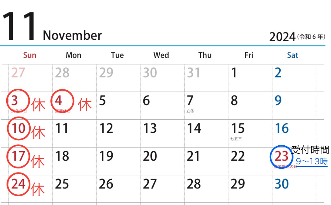 11/23(祝土)は、特別診療! 11月のスケジュール