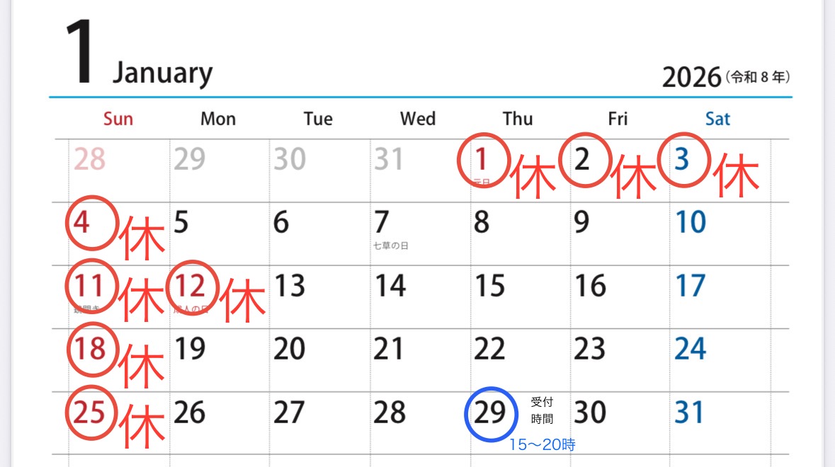 1/29は、午前の部はお休みいたしますので午後の部15時~20時のみ受付しております。