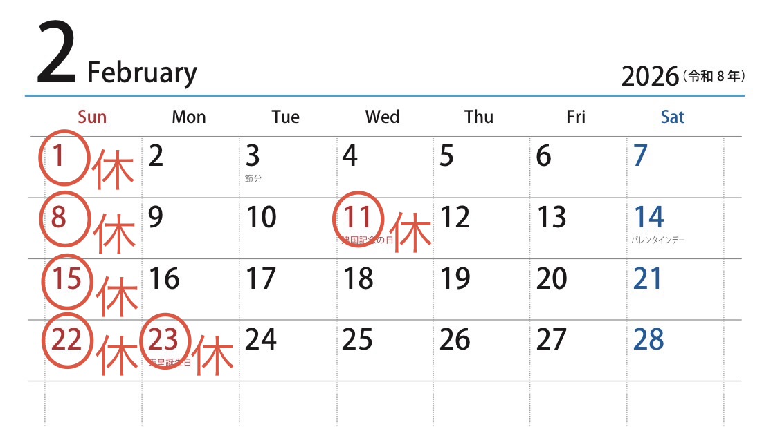 2月も平常通り日曜・祝日はお休みとなります。